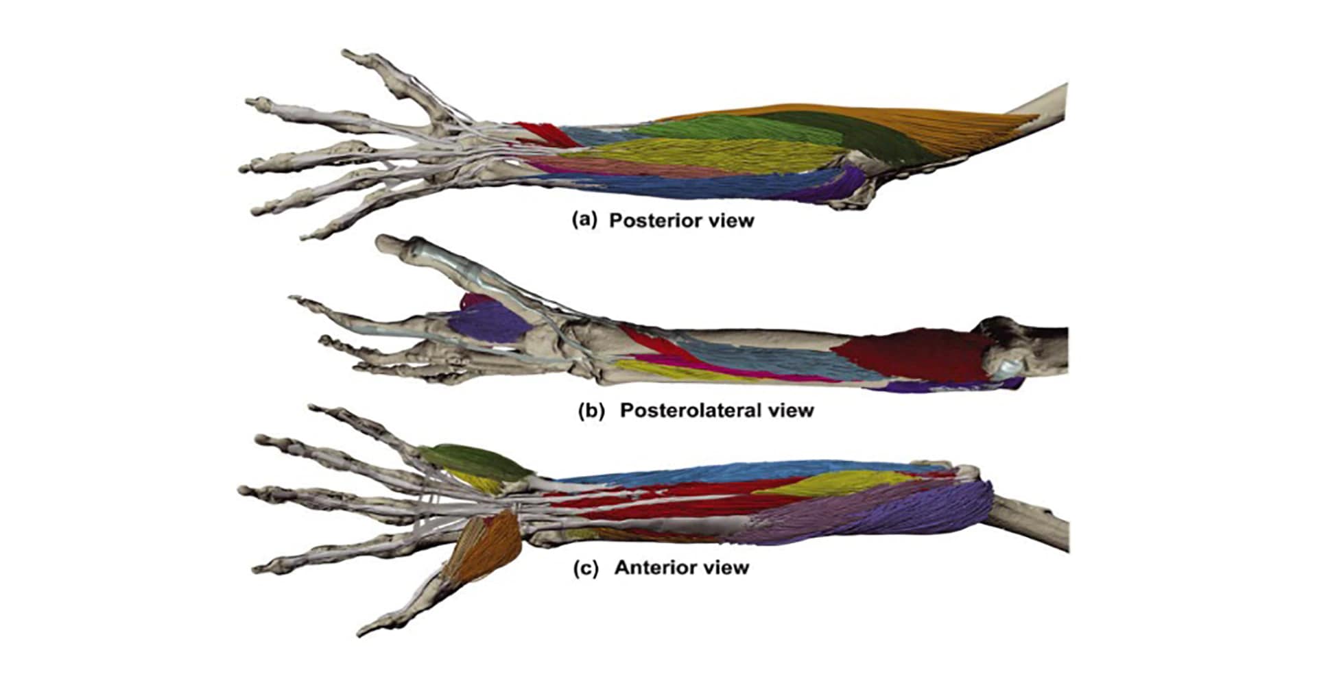 Technology has markedly improved the data that are used to generate musculoskeletal models; however, the need for more detailed musculotendinous architectural data persists. To address this need, we have digitized three-dimensional (3D) coordinate data of the fibre bundles (FBs) throughout the volumes of all 20 forearm muscles to generate a comprehensive database of the musculotendinous anatomy. The computerized reconstruction of the forearm anatomy enabled us to quantify muscle architectural parameters, as well as to visually examine the intricate spatial relationships between muscles and the 3D arrangement of FBs relative to their tendons and the underlying skeleton. The muscles of the forearm exhibited a wide range of architectural variation that we quantified using 3D geometric principles. This database improves upon that of previous studies and facilitates more detailed description of the muscle architecture in a format that can be used to inform and advance the development of state-of-the-art dynamic models for biomechanical simulations.