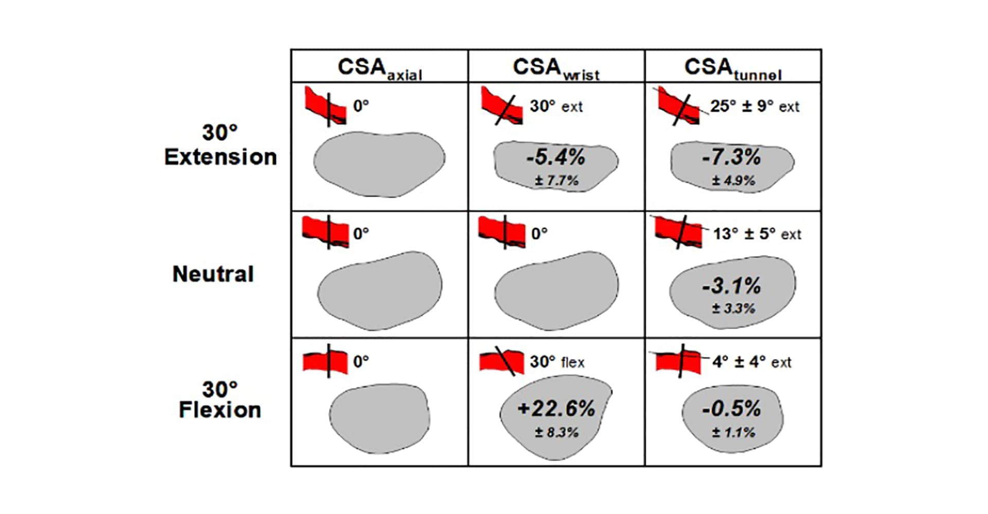 While deviated wrist postures have been linked to the development of carpal tunnel syndrome, the relative contributions of posturerelated changes in size, shape and volume of the carpal tunnel contribute to median nerve compression are unclear. The purpose of this study was two-fold: (1) to reconstruct the carpal tunnel from MRI data in neutral and non-neutral (30° extension, 30° flexion) wrist postures, and (2) to evaluate errors associated with off-axis imaging. Three-dimensional reconstruction of the carpal tunnels of 8 volunteers from the university community revealed that the orientation of the carpal tunnel was not directly explained by external wrist angle. The average orientation of the carpal tunnel was extended in all postures, ranging from 25°±9° in extension, 13°±5° in neutral and 4°±4° in the flexed wrist. Changing the orientation of the imaging plane to be perpendicular to the reconstructed carpal tunnel revealed that axial images overestimated cross-sectional area by an average of nearly 10% in extension, 4% in neutral and less than 1% in flexion. Similarly, adjusting the imaging plane to be perpendicular to external wrist angle overestimated cross-sectional area by an average of 2% in extension, 4% in neutral and 24% in flexion. Distortion of the carpal tunnel shape also became evident with rotation of the imaging plane. The data suggest that correction for the orientation of the carpal tunnel itself to be more appropriate than relying on external wrist angle. Computerized reconstruction provided detailed anatomic visualization of the carpal tunnel, and has created the framework to develop a biomechanical model of the carpal tunnel. Similar reconstruction of the tissue structures passing through (median nerve and flexor tendons) and entering the carpal tunnel (muscle tissue) will enable evaluation and partitioning of median nerve injury mechanisms.