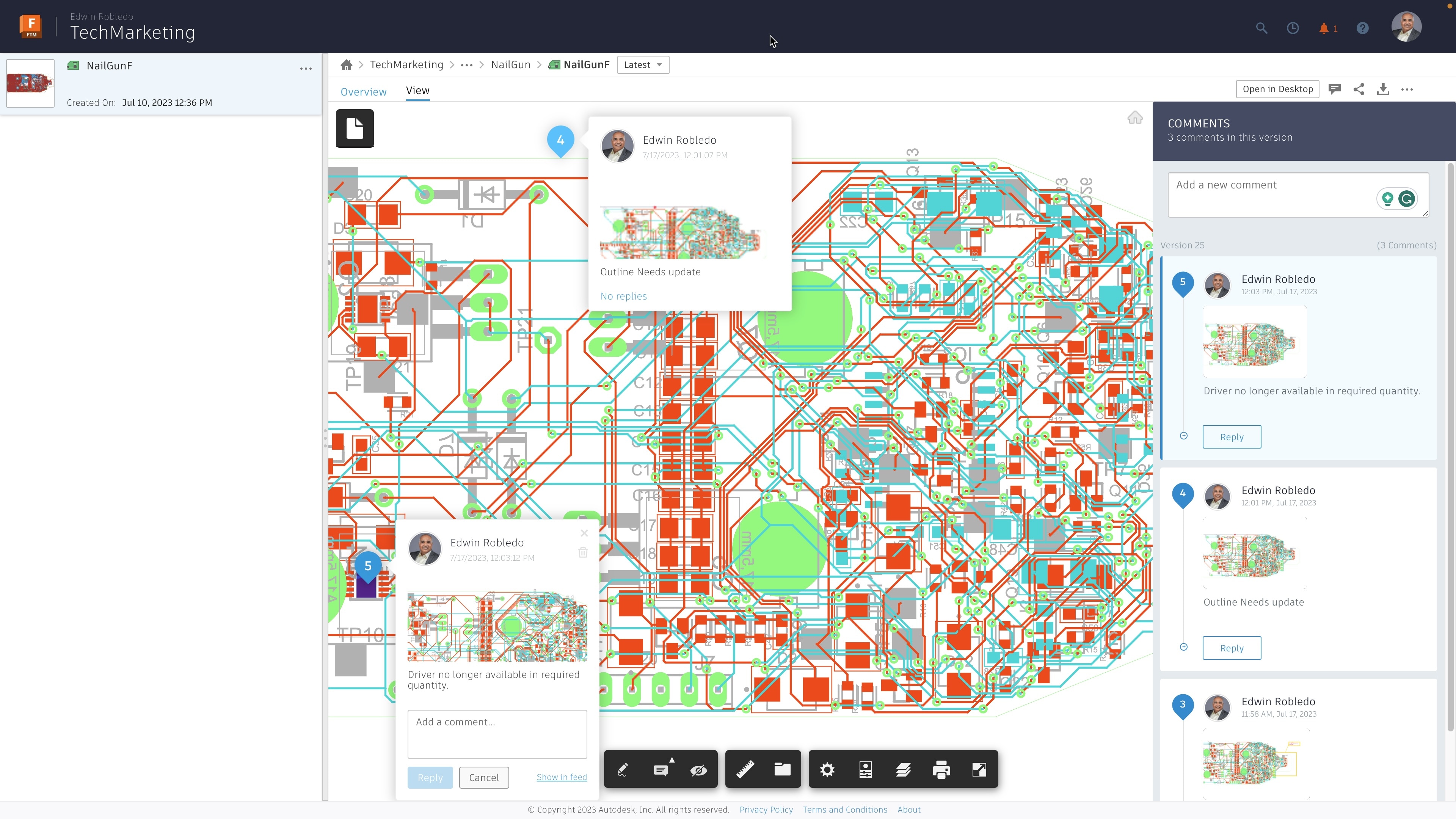 The Fusion electronics design capabilities provide managed team access to the project with instant updates to the latest version. Built-in versioning, milestone referencing, and web-based access to designs enable stakeholders to comment, track progress, and collaborate effectively.