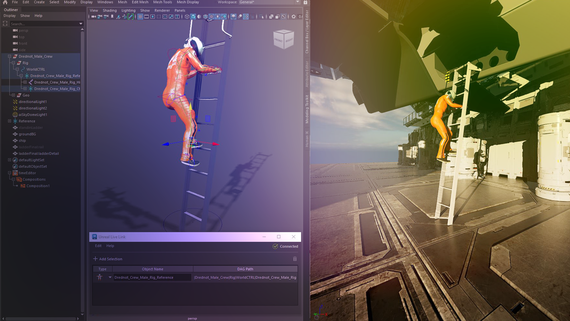 Unreal Live Link for Maya makes it easy to stream animation data from Maya to Unreal Engine in real-time. Using the plugin, artists can work on character assets in Maya and see previews of their work reflected immediately in Unreal, as they iterate. In a virtual production setting, Unreal Live Link tightens the feedback loop, allowing filmmakers to make real-time decisions on set and quickly see changes in context.