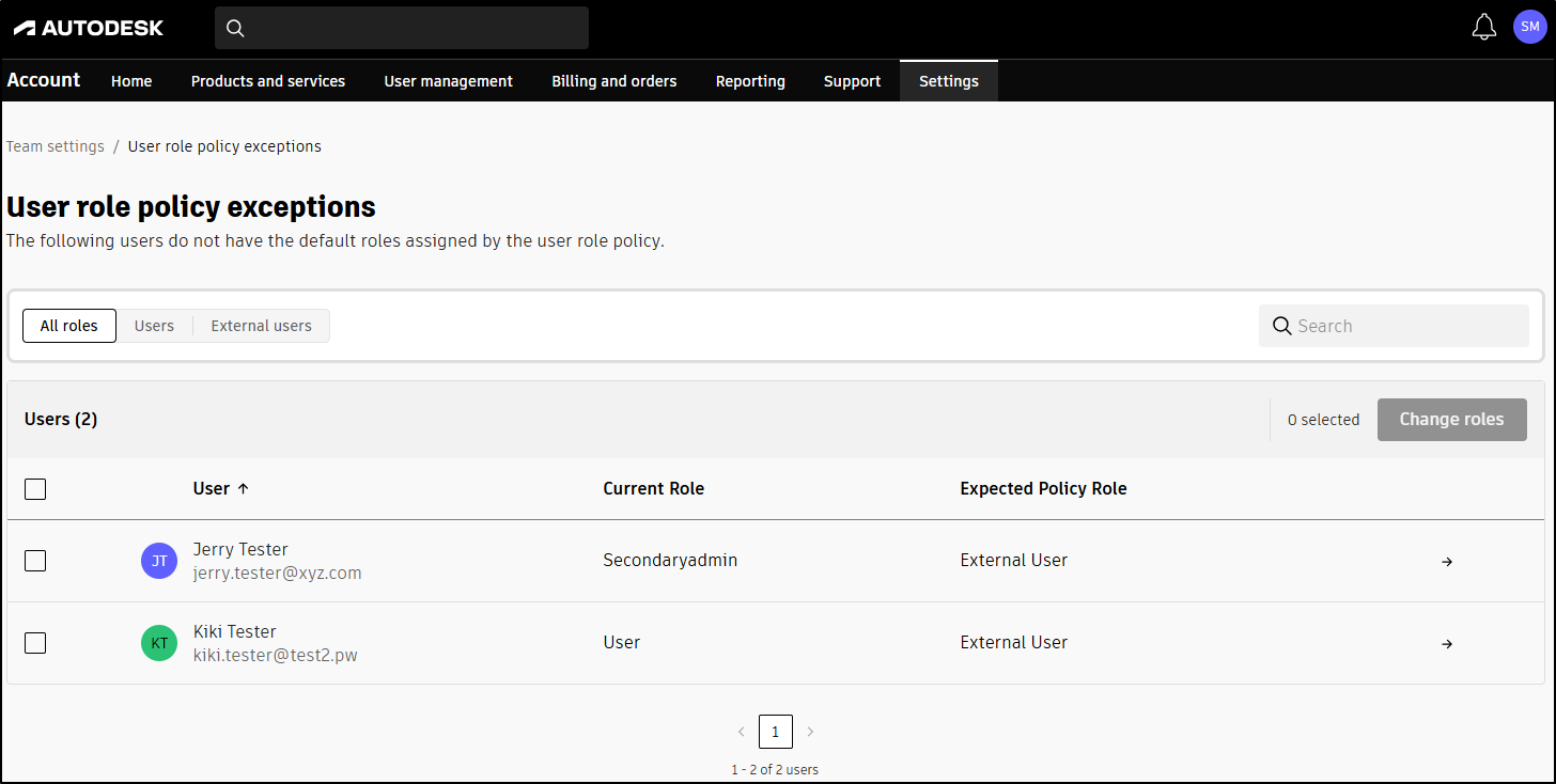 When you use the default user management based policy, anyone added to your team through an Autodesk cloud collaboration product, like Autodesk BIM Collaborate Pro, Autodesk Build, or Autodesk Takeoff, is automatically set as an external user in the Autodesk account.