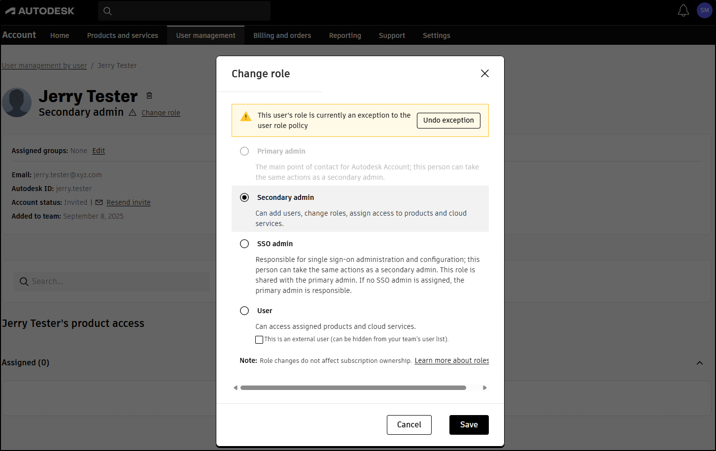 If you change a user’s role that follows your domain rules, you’ll see a message saying this update will create an exception. Change the role if you don’t want the user to follow your domain policy. To remove the exception, go to the user’s details or your team settings to view all exceptions.